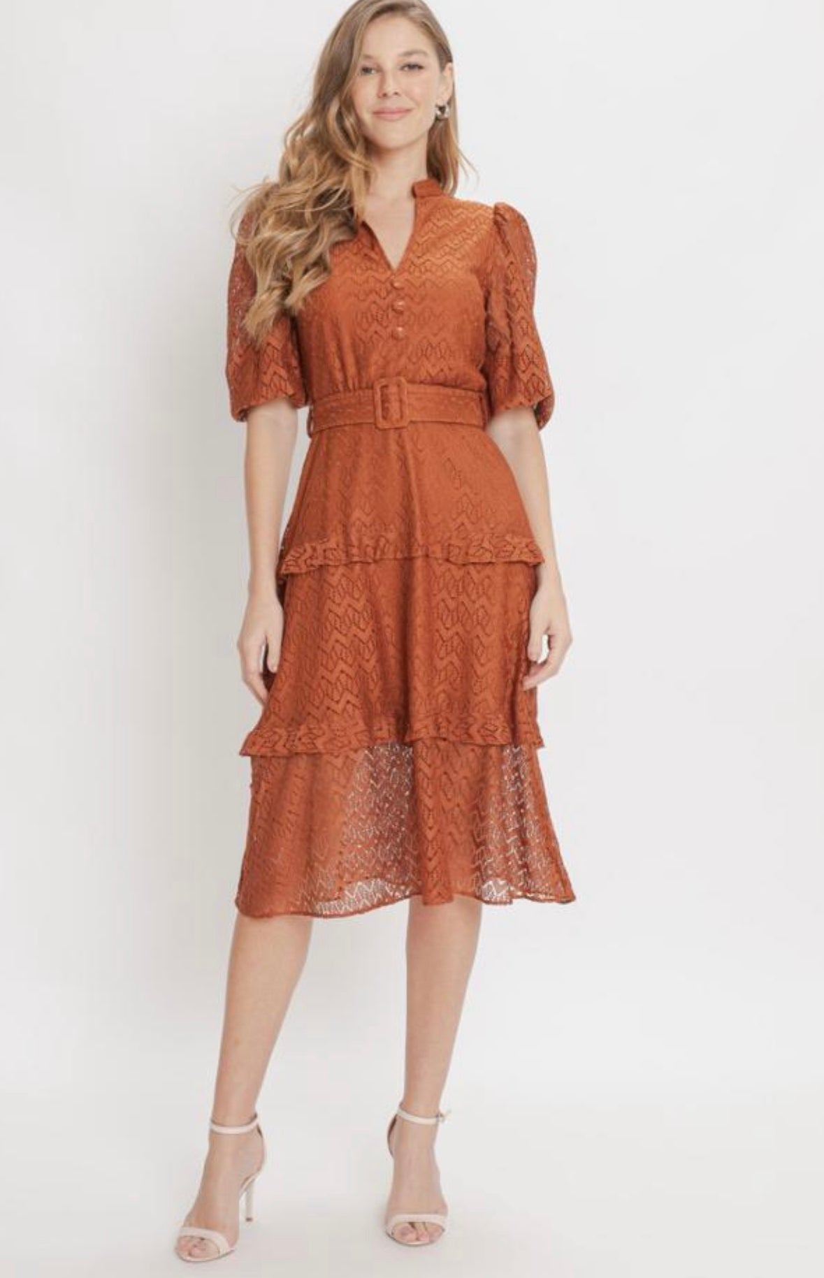 ADIRA LACE BURNT ORANGE TIERED RUFFLE MIDI DRESS
