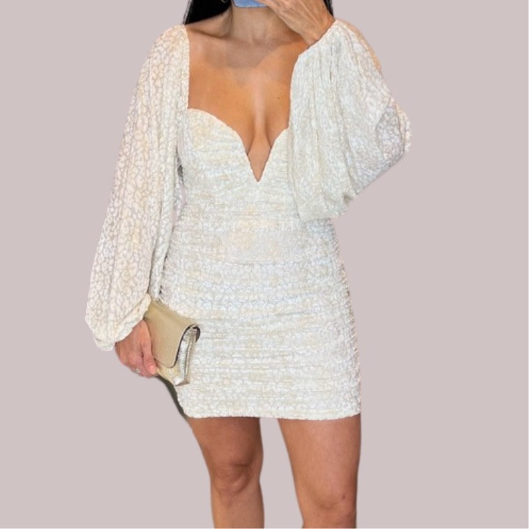 We are obsessing over this dress for your bachelorette party, night out with the girls, date night, or just because! This velvet cream dress with gold metallic accents features a bodycon fit with some ruching, plunging sweetheart neckline, lantern puffy sleeves tailored with elastic to hold in place. Pair with some strappy heels and a statement clutch to complete your look.
