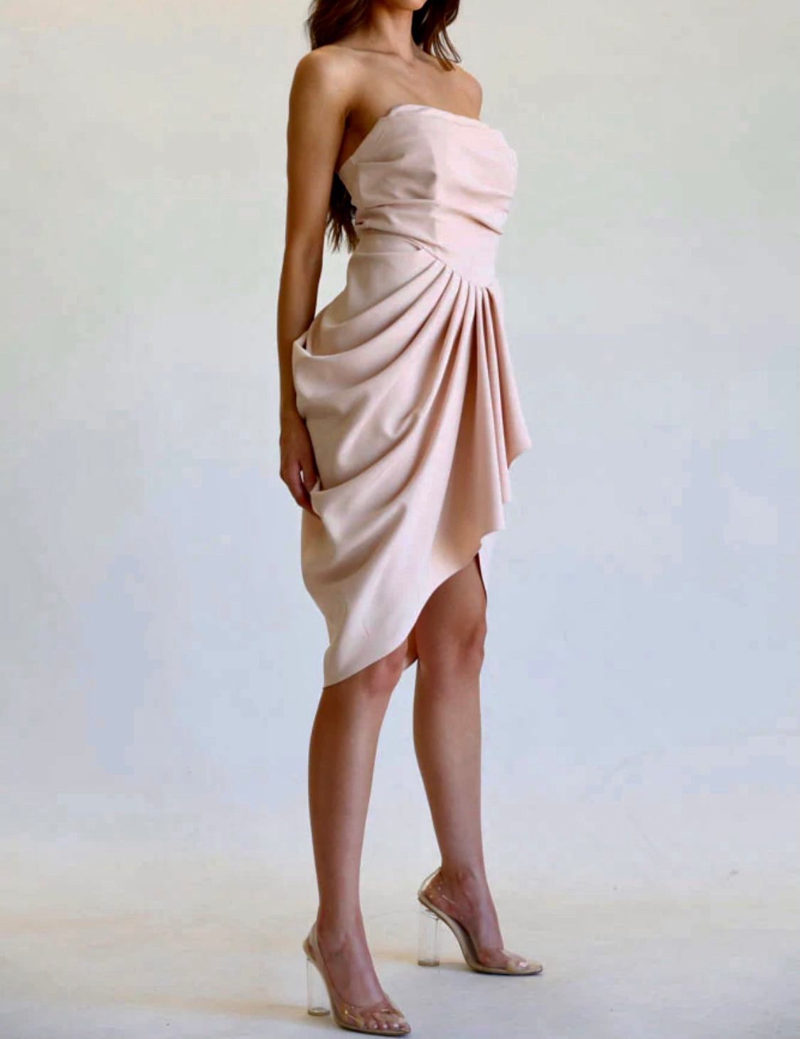 Featuring a strapless corset bodice with boning, draped front and back waterfall detail, tulip hem, and a hidden back zipper. Pair with stiletto or chunky heels to complete your look.