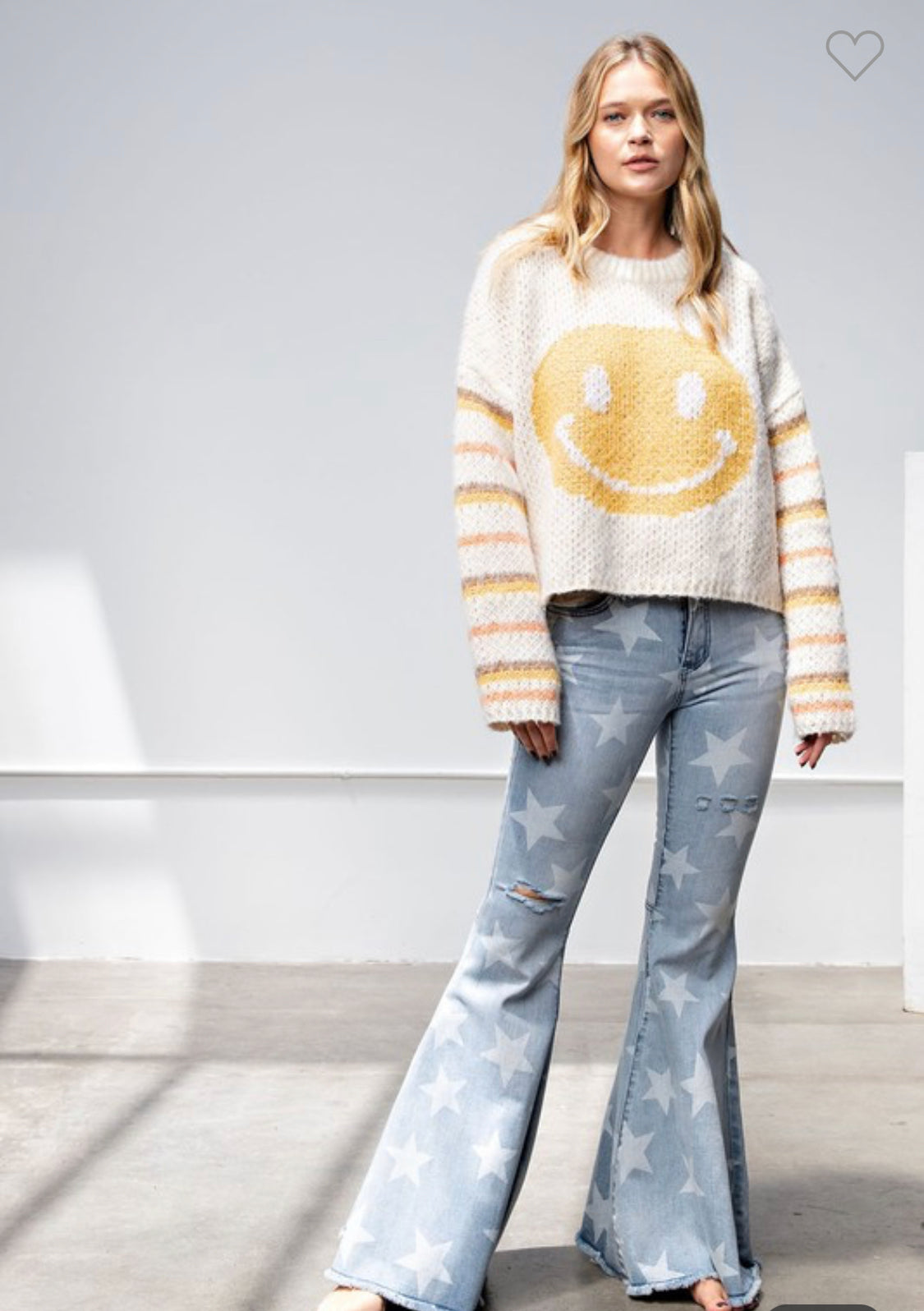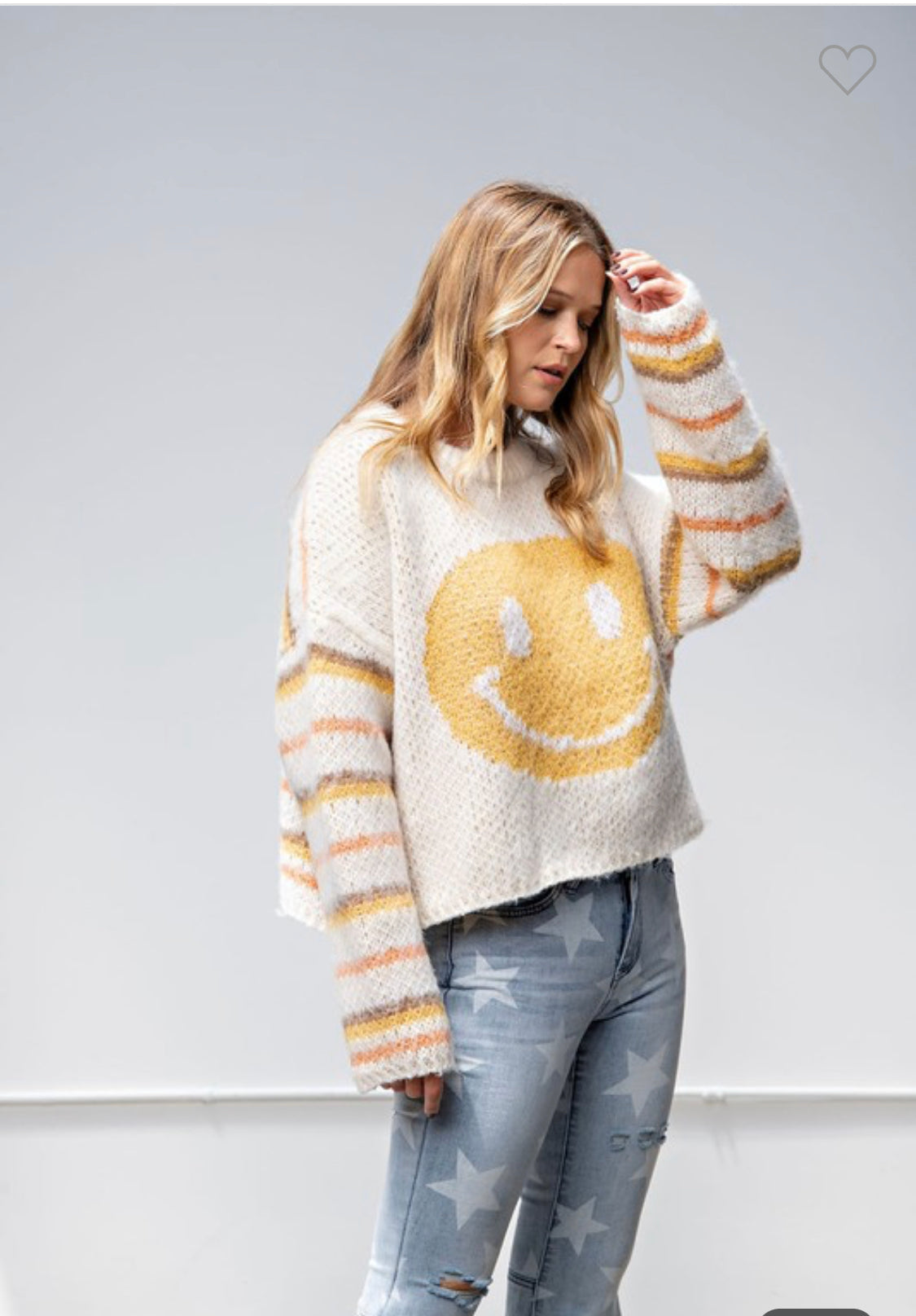 This cozy sweater is made from a butter soft knit fabric that feels comfortable and gentle against the skin. It features a fun smiley face design on the front, adding a touch of whimsy to any outfit. The sweater also features a stripe print down the sleeves and back, creating a dynamic and eye-catching look. The scoop neck and relaxed fit make this sweater both stylish and comfortable, allowing for easy layering with other pieces. Whether you're running errands or lounging at home, this sweater is sure to keep you feeling warm and looking great.