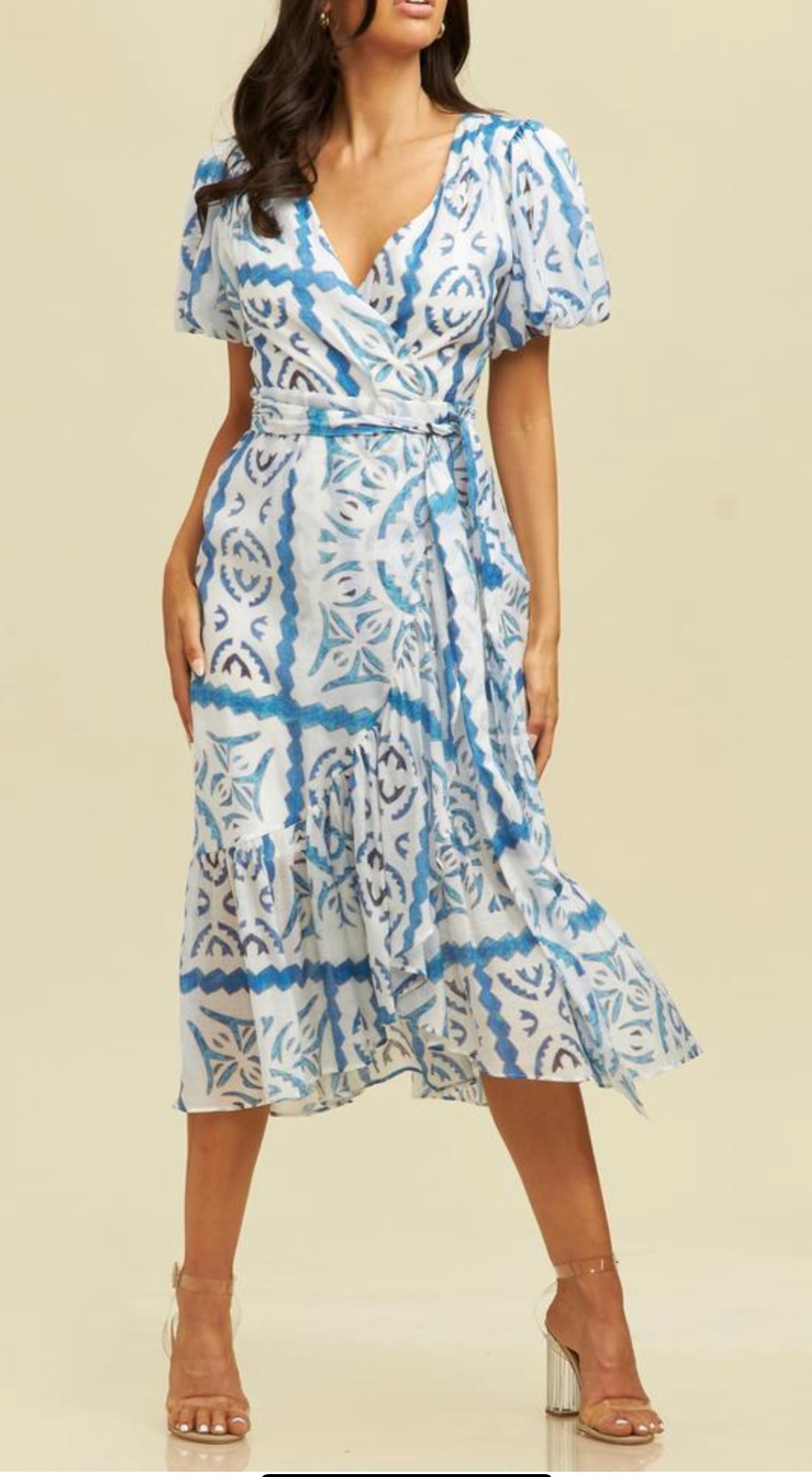 All dressed and ready to go anywhere in this lovely blue print midi. This beautiful blue print midi features a v-neckline, puff sleeves, slight open back with button closure, self tie waist sash, tiered ruffle hem, light weight woven fabric, fully lined skirt, and faux wrap front detail. Pair with a chunky or strappy heel and a coordinating clutch to complete your look.