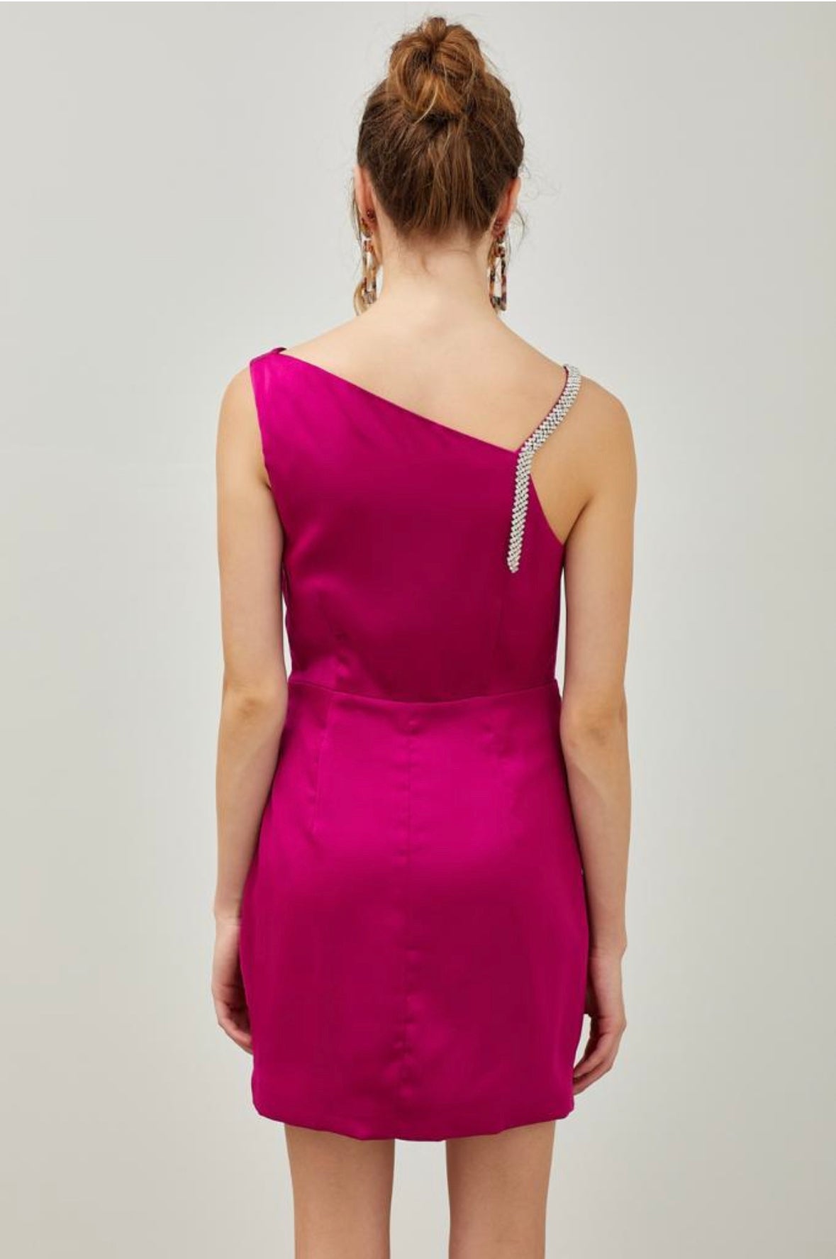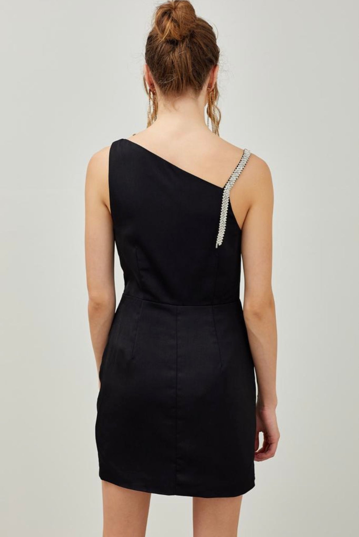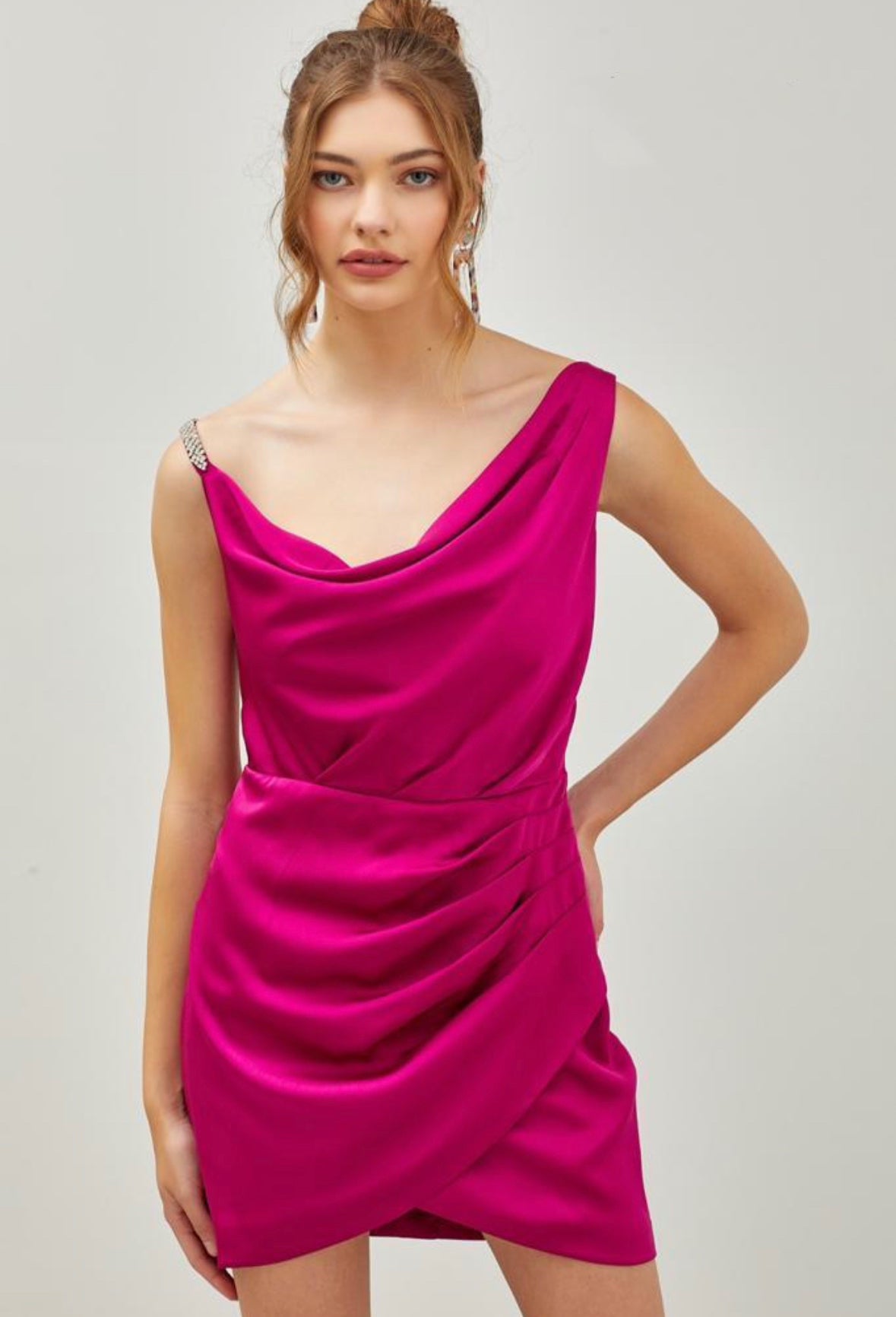 GABRIELLA SATIN COWEL NECK RHINESTONED STRAP MINI DRESS