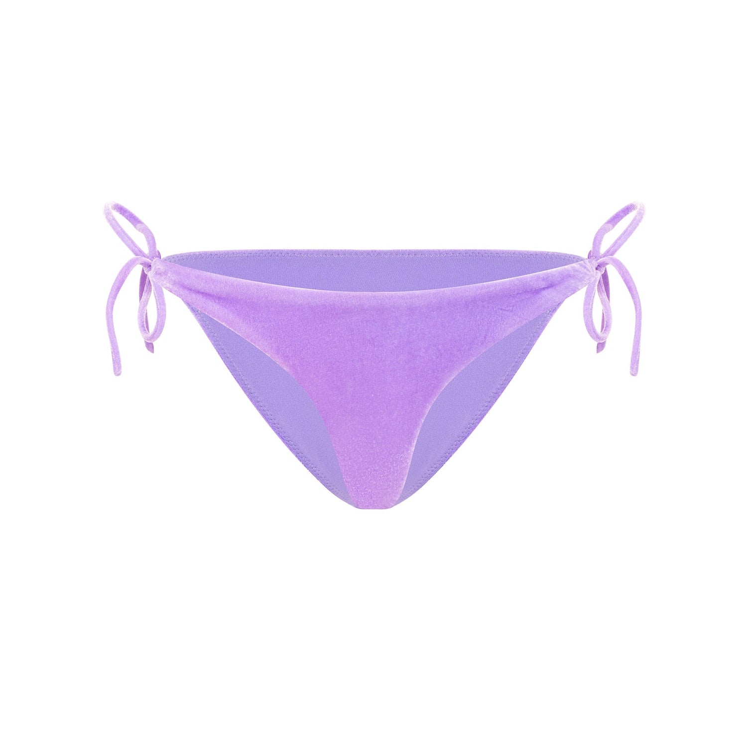 Bikini bottoms feature a cheeky style, soft velvet fabric with side self ties.