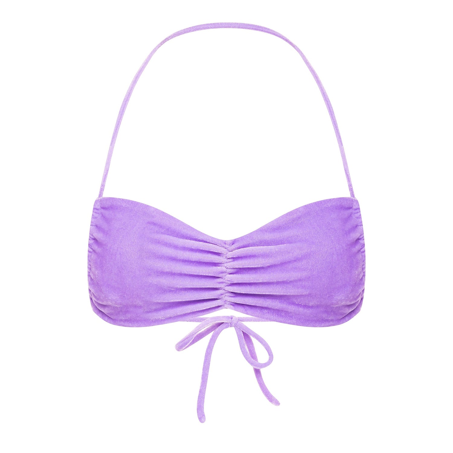 This bandeau style bikini top features a soft velvet fabric, over the neck strap and self tie back.
