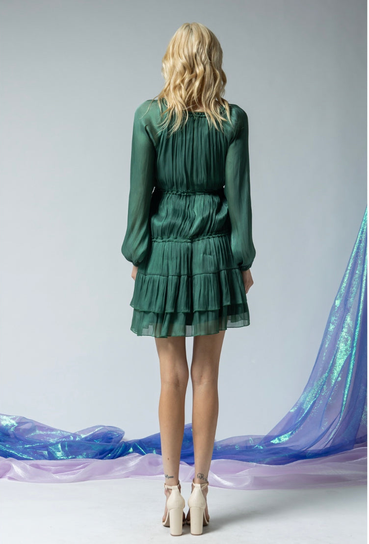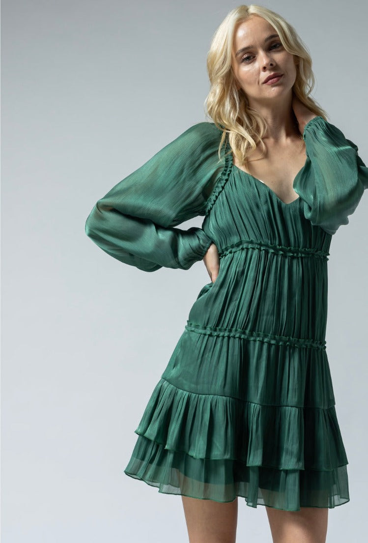 This effortlessly elegant baby doll dress with an empire waist features, long sleeves, sweetheart neckline, light shimmer sateen fabric, tiered ruffle details and hidden back zipper. Pair this timeless dress with a pair of tall boots, booties, chunky or stiletto heels. Add a coordinating clutch to complete your look.