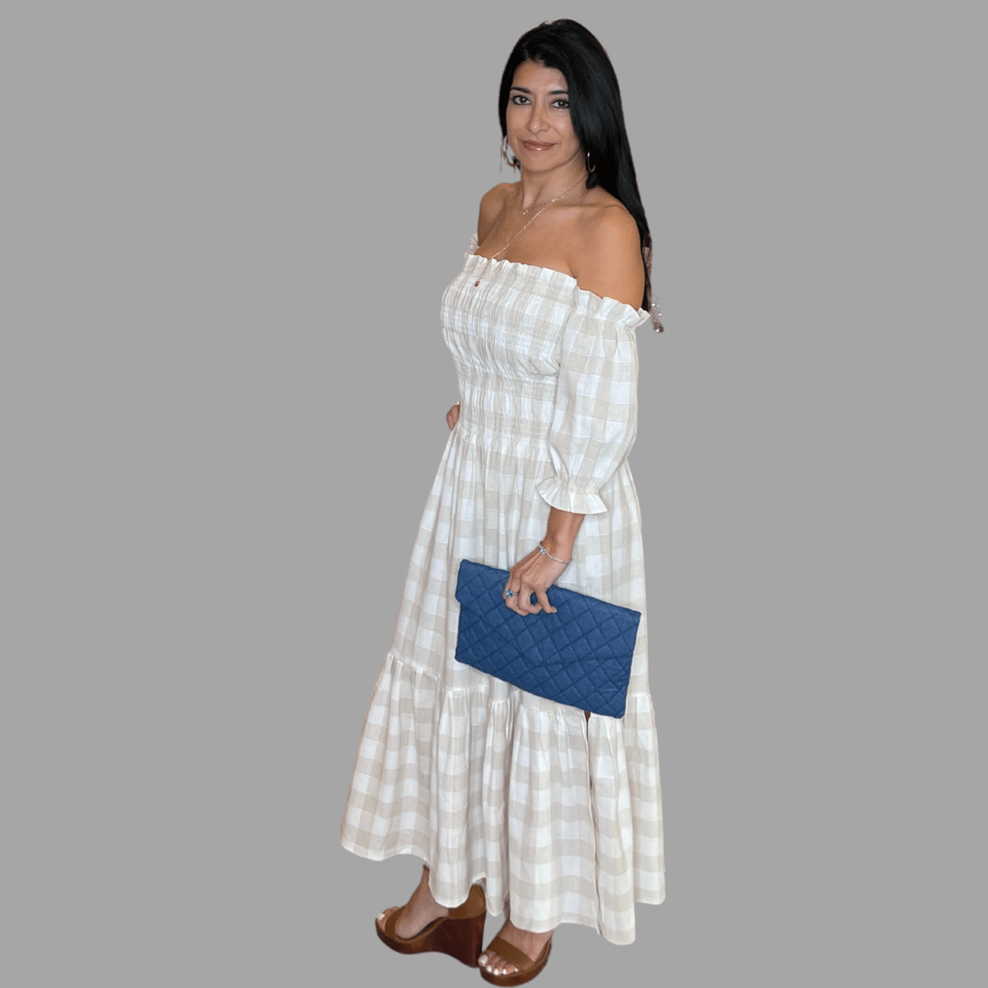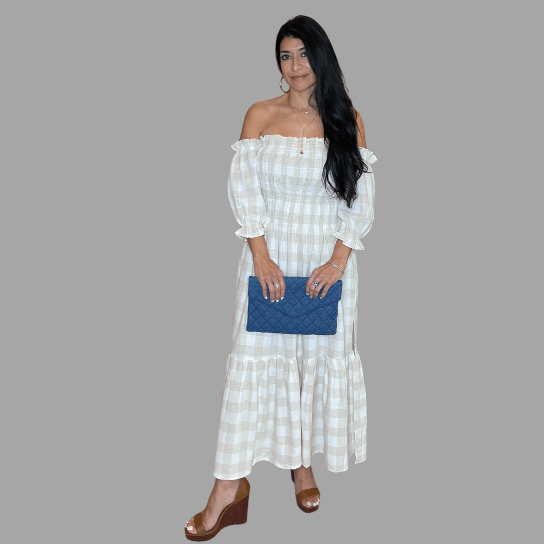 MARIELLA OFF THE SHOULDER CHECKERED SMOCKED MAXI DRESS