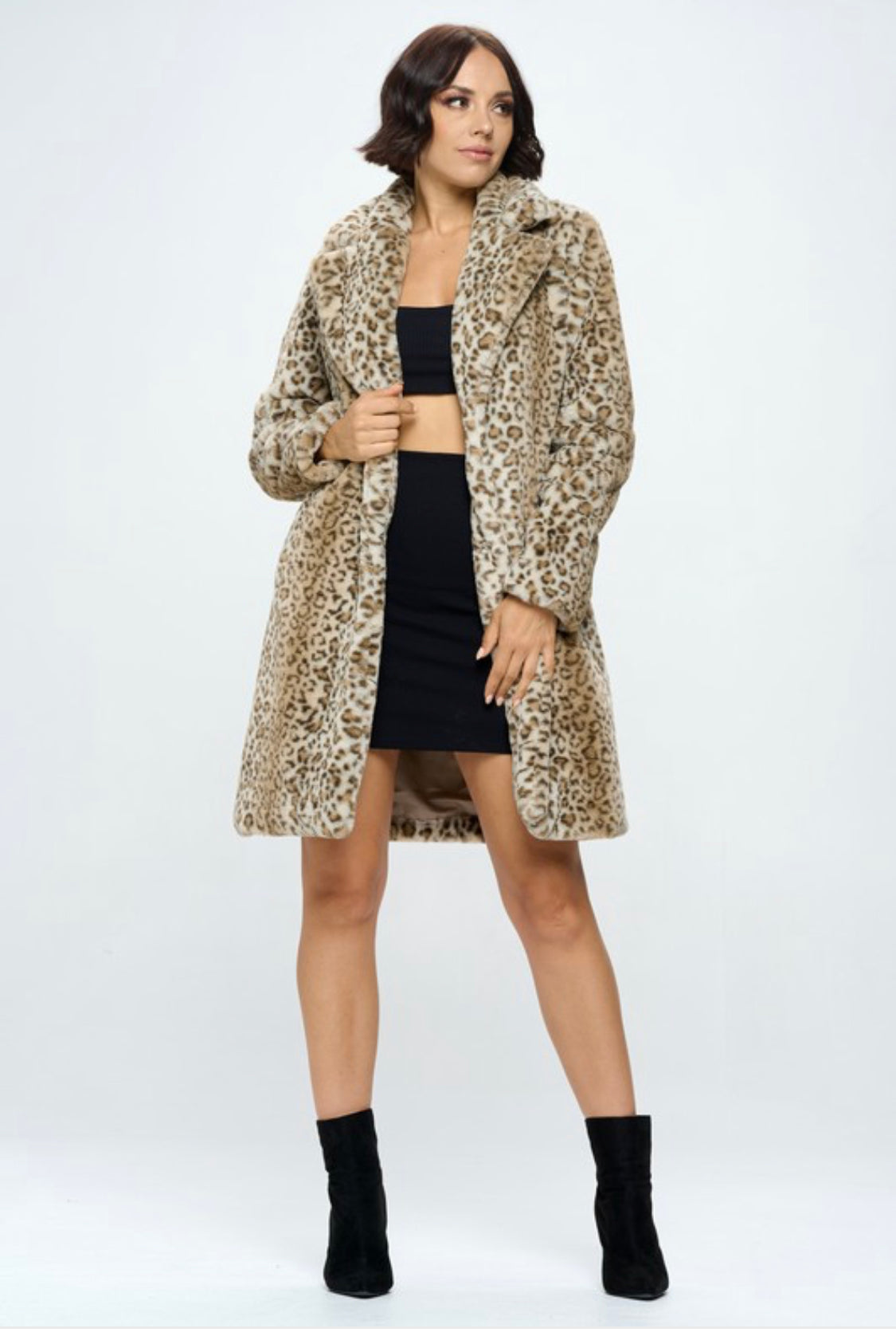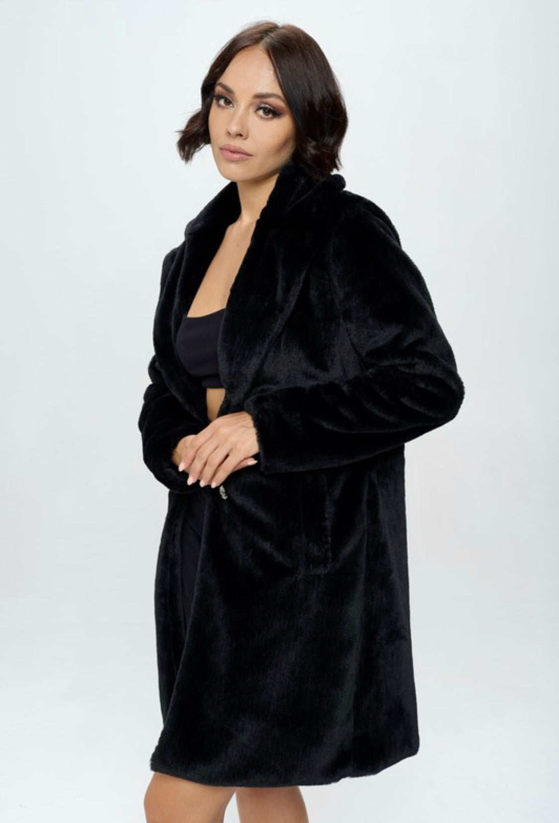 This insanely soft & cozy collard, mid length faux-fur coat is guaranteed to top off any outfit! This fully lined coat features, two front pockets, 2 Button snap closure and a roomy silhouette.