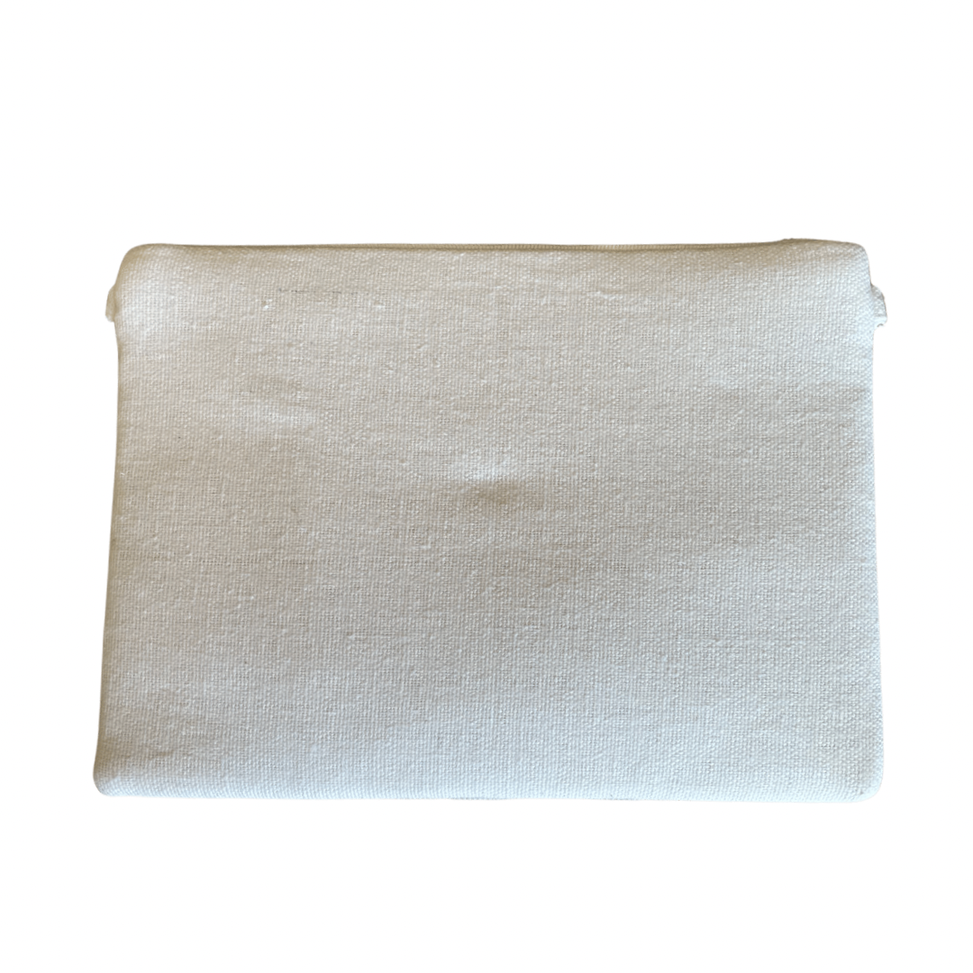 This gorgeous clutch features, red, white, and blue beads throught the front of the purse, a white canvas back, one inside slip pocket, snap button closure, and 30" silver chain.