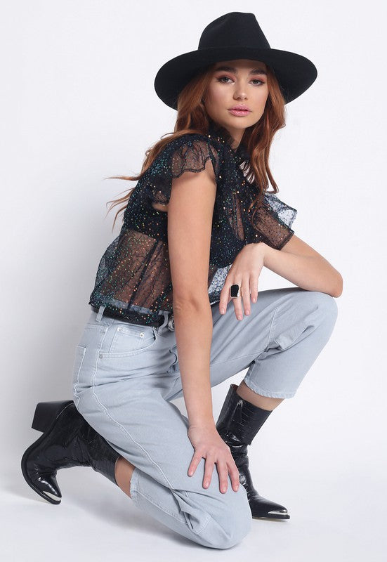 Sheer All over sequin Mock neck Ruffle sleeves 100% polyester Woven