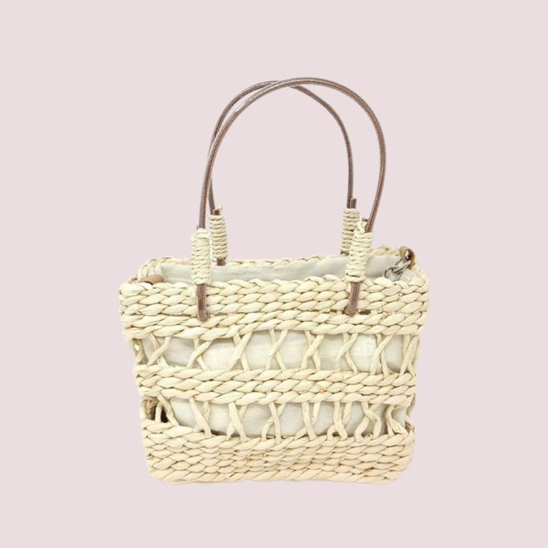 This woven straw bag is must have summer accessory! Bag features an open weaved pattern, formed handles, and includes a removable leather shoulder strap.