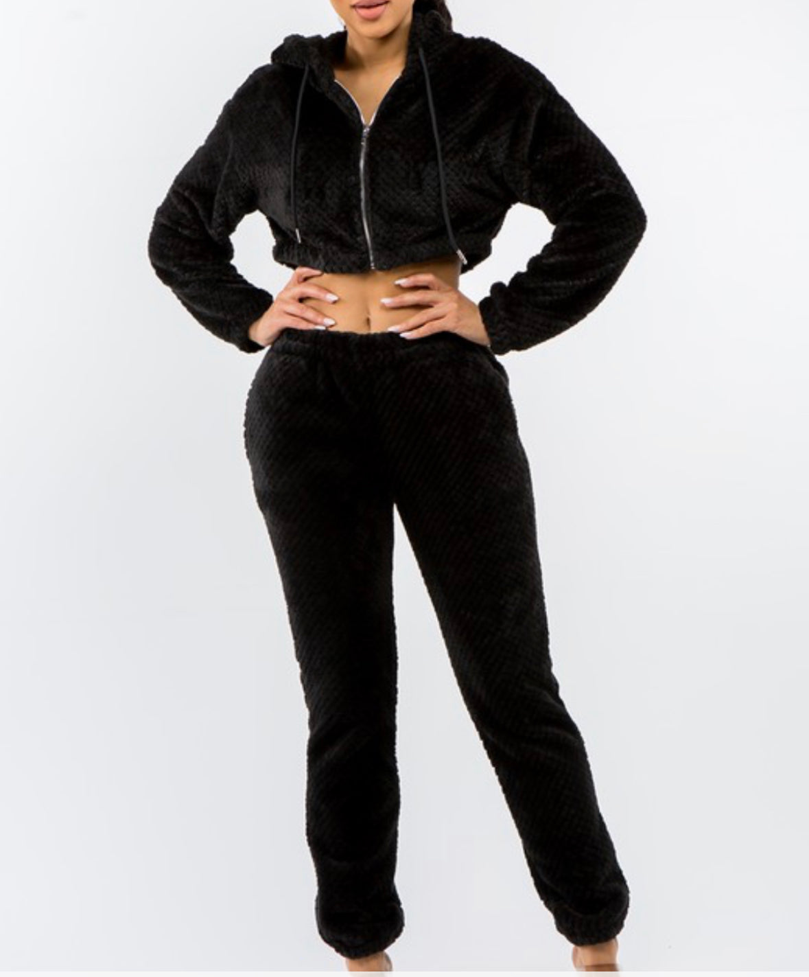 Cozy up in this 2 piece set featuring a zip up cropped hooded sweater, elastic cuffs around the wrists and ankles, low rise pants, side pockets, in a thick plush velvet material. Add your favorite sneakers to complete your look.