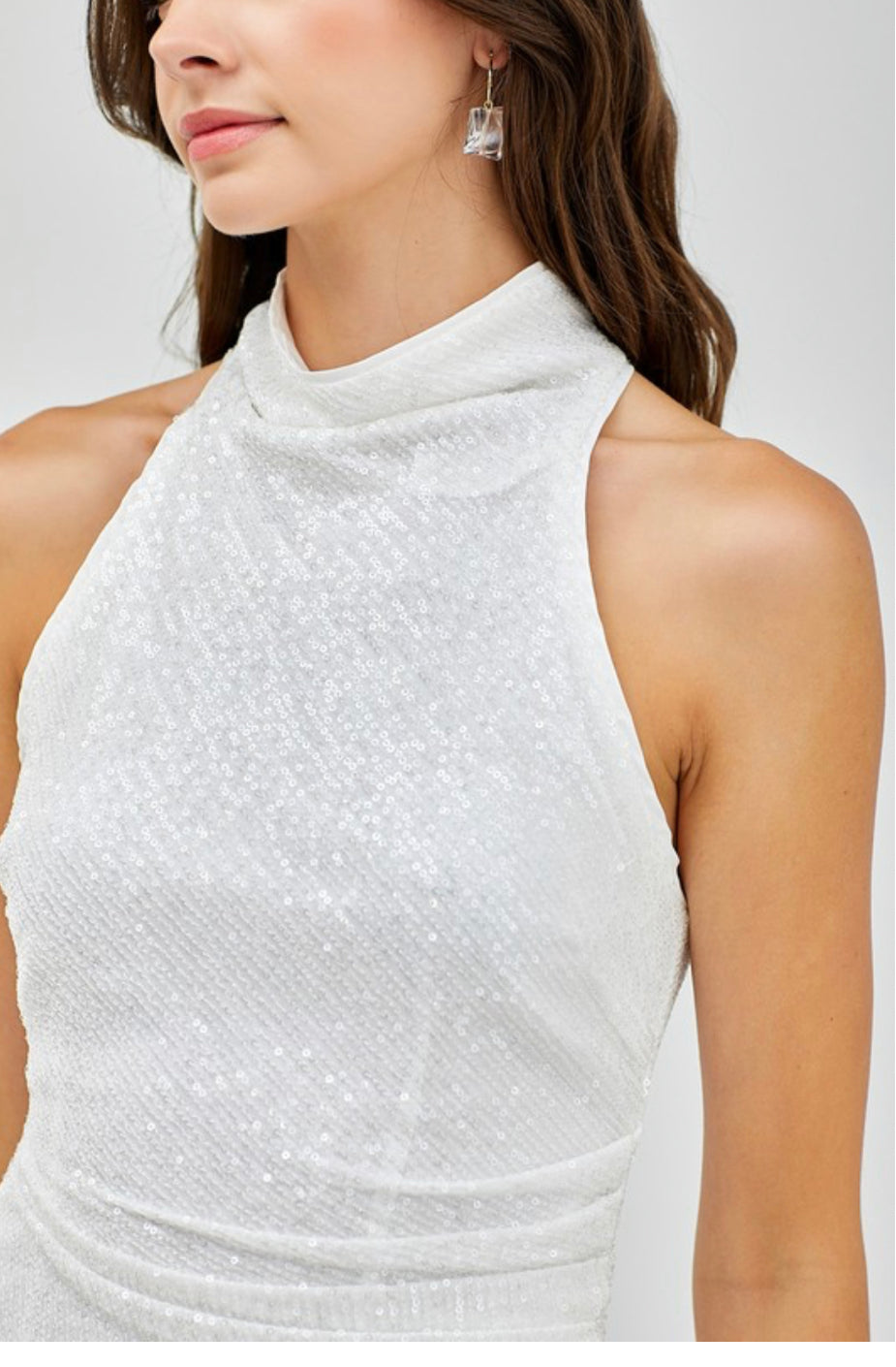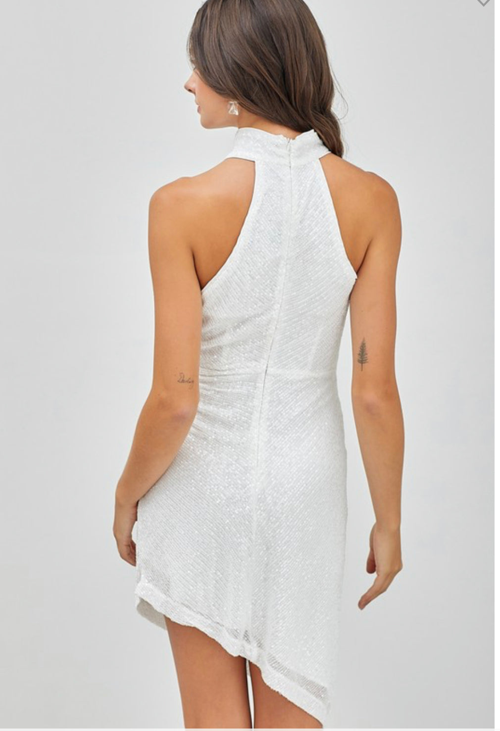 Make an entrance with this shimmering, elegant dress! Featuring high neckline, sleeveless, hidden back zipper, delicate ruching, and an exquisite asymmetrical hemline, the perfect subtle sparkle. Ideal for any holiday gathering, New Years eve party, or Bridal events. This dress is sure to make you feel sophisticated. Complete your look with a pair of strappy stilettos or a chunky heel.