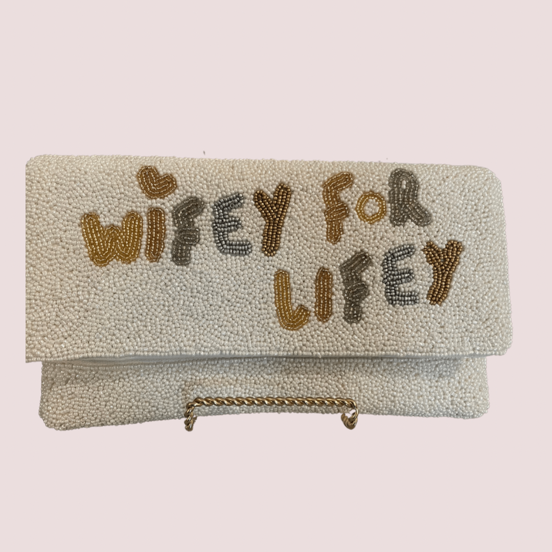 This gorgeous beaded WIFEY FOR LIFEY handbag perfect for all the bride to be events as well as the honeymoon! This versatile clutch doubles as a crossbody with a delicate gold chain.