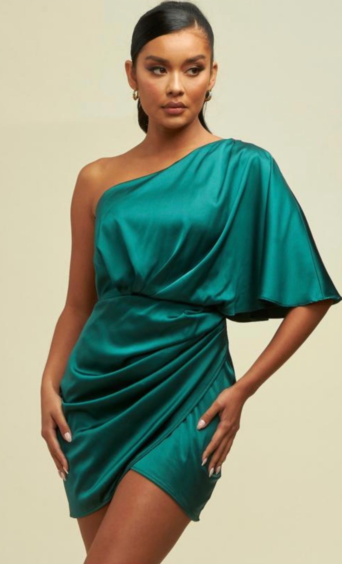 This asymmetrical one shoulder, fully lined satin mini dress will have you feeling unapologetically confident. Featuring a feminine soft satin fabric, Asymmetrical neck line, one shoulder draped 1/2 sleeve, faux wrap front detail, with hidden side zipper closure.