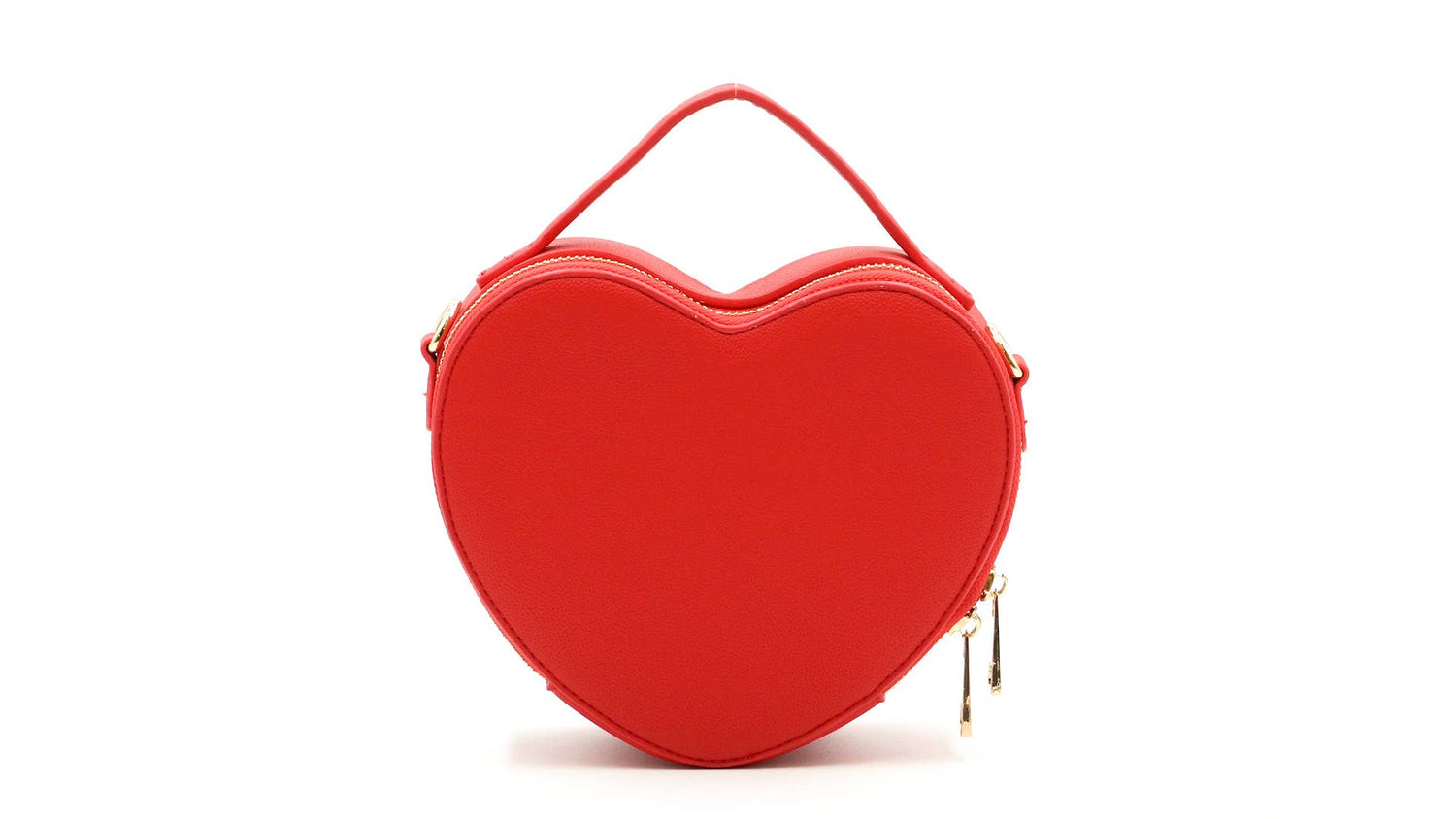 Sending love by the handle with this adorable heart shaped structured shoulder bag composed of saffiano vegan leather. Equipped with a top handle as well as an adjustable/detachable long strap. Gold hardware detailing. Two way zipper opening into a lovely polka dotted interior spacious for carrying phone and small essentials.