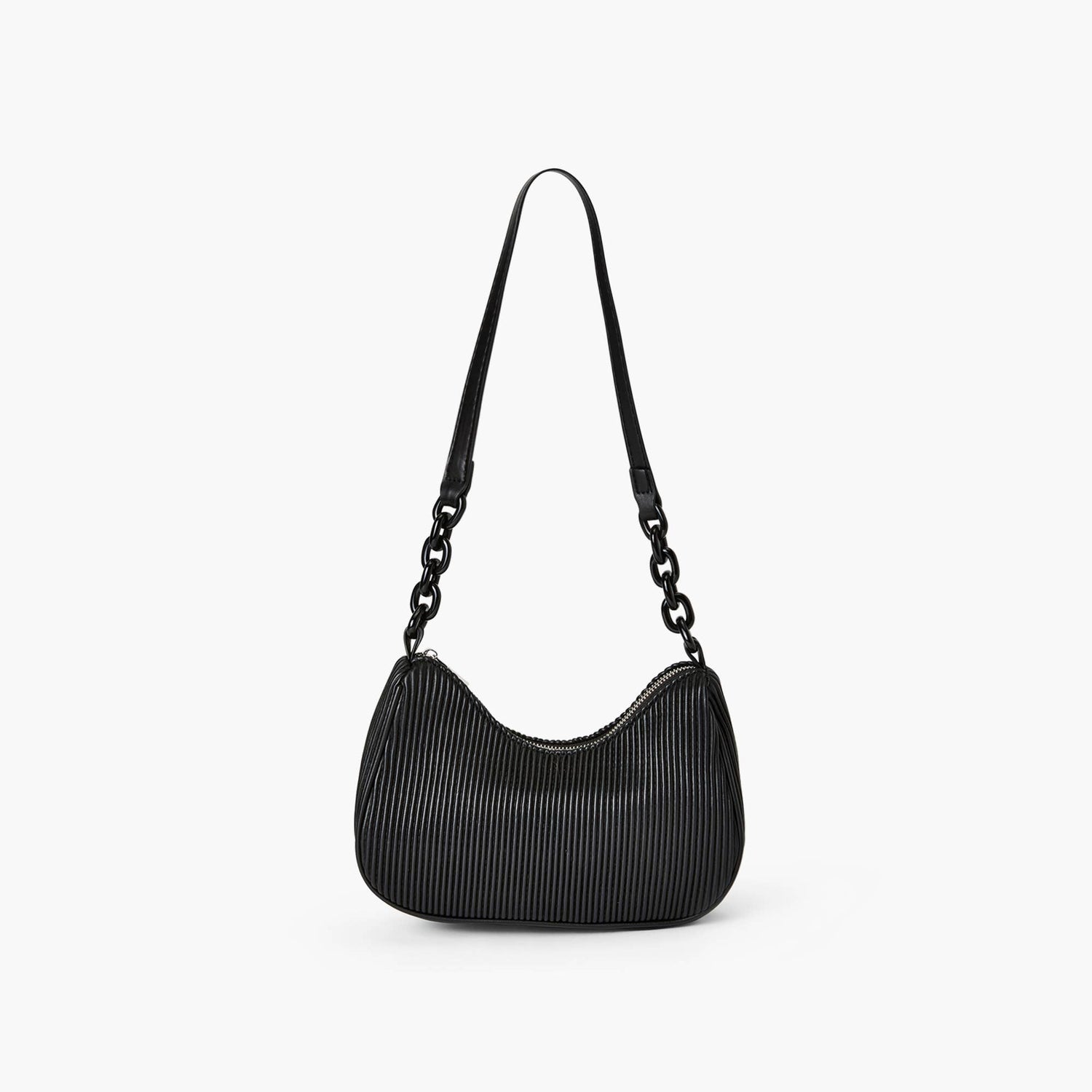 A fresh look to the classic shoulder bag with its pleated vegan leather composition. Crescent shaped upper body for a snug shoulder fit. Acrylic ring meshed with vegan leather shoulder strap. Silver hardware for a zipper closure leading to a snug polyester lining interior with a vegan leather logo embossed card slot. Store your everyday essentials and enjoy the lightweight access of this everyday purse.