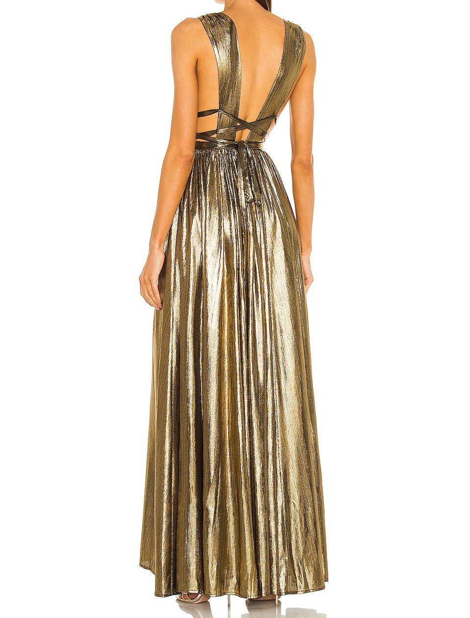 The thigh-high slits on both sides of the gown add a touch of sexiness and allow for ease of movement. The lace-up open back detail adds an unexpected and alluring touch to the overall look. The metallic gold fabric of the gown adds a luxurious and glamorous feel, making it perfect for formal events such as prom, weddings, or black-tie events.
