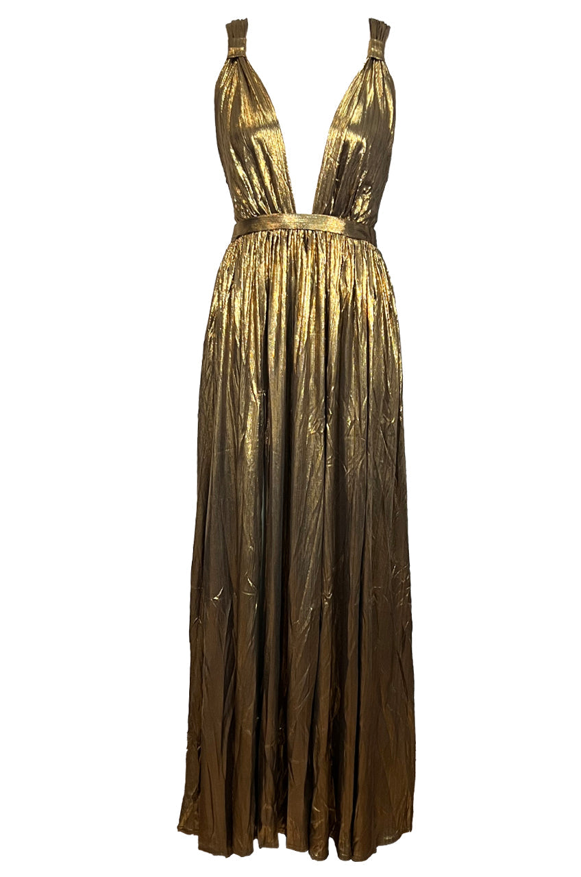 This stunning gold gown is sure to make a statement at any formal event. The plunging neckline adds a touch of drama and sophistication, while the wide straps feature slip knot details that add visual interest and texture. The dress also comes with a wrap belt, which cinches at the waist and flatters the figure.