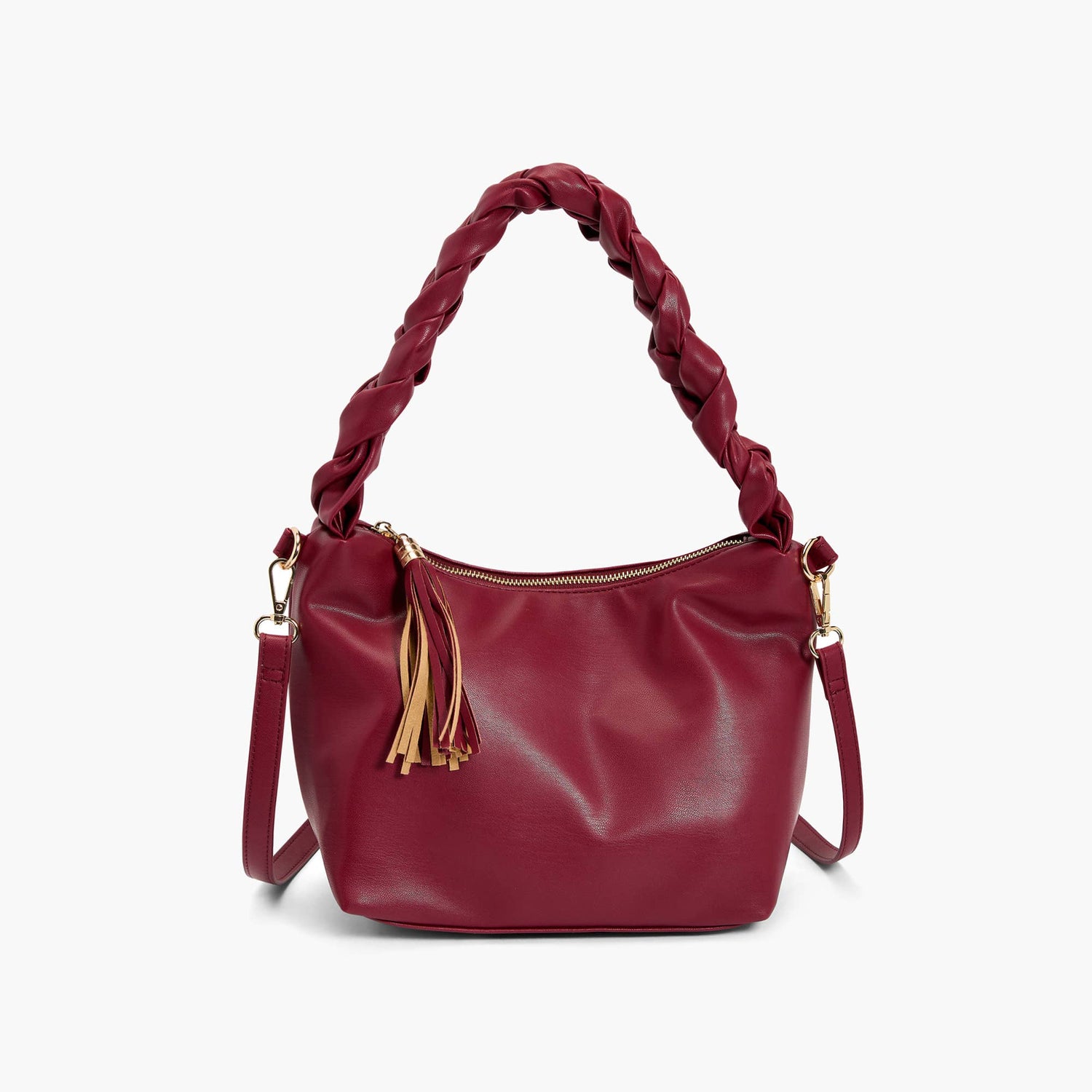 Fall in love with this classic shaped bag that is made out of soft vegan leather. Feel the unique cushioned braided strap that will hug your shoulder. This bag comes accessorized with a matching leather tassel.