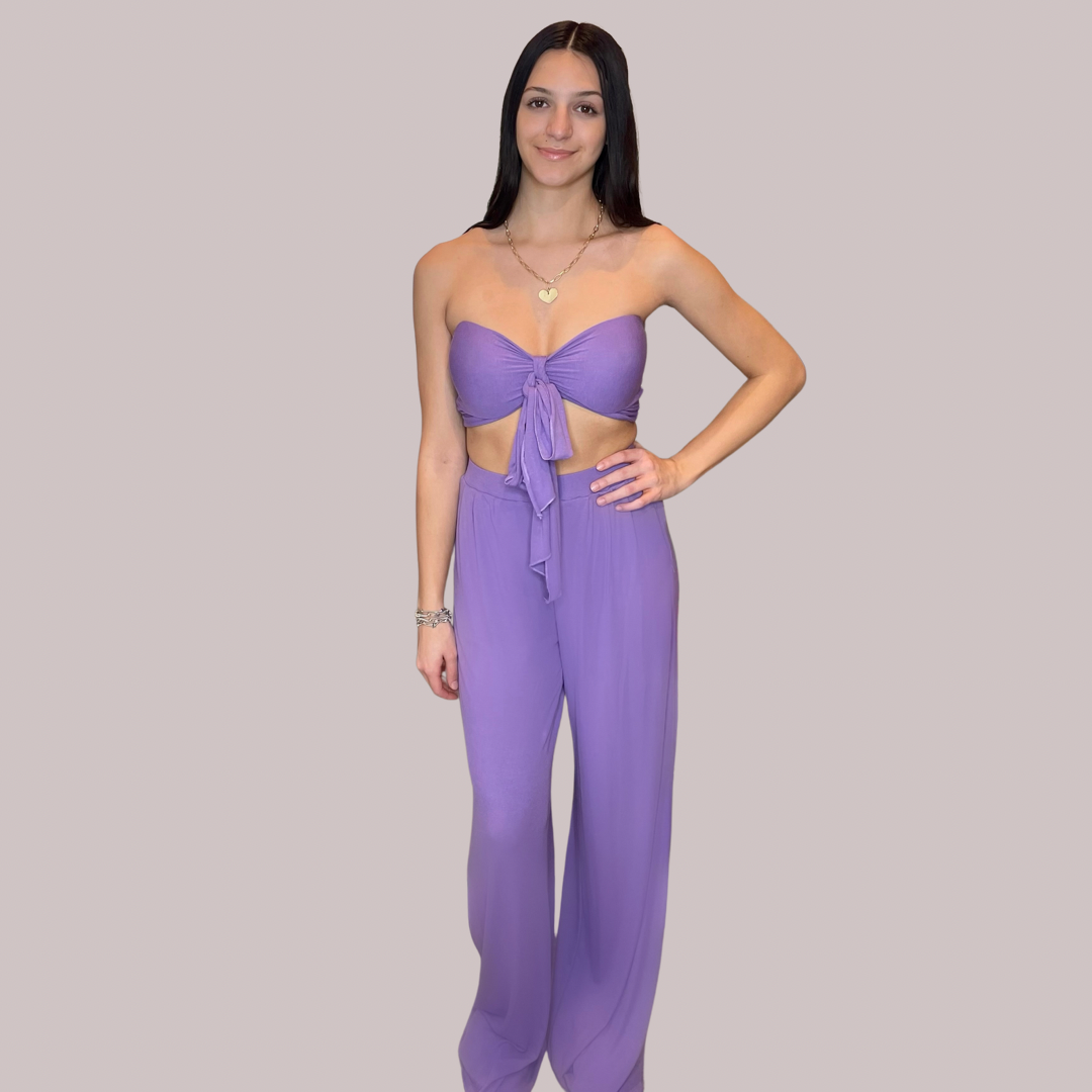 Two piece wide leg pant set. Bandeau top can be worn as halter or a tube top.